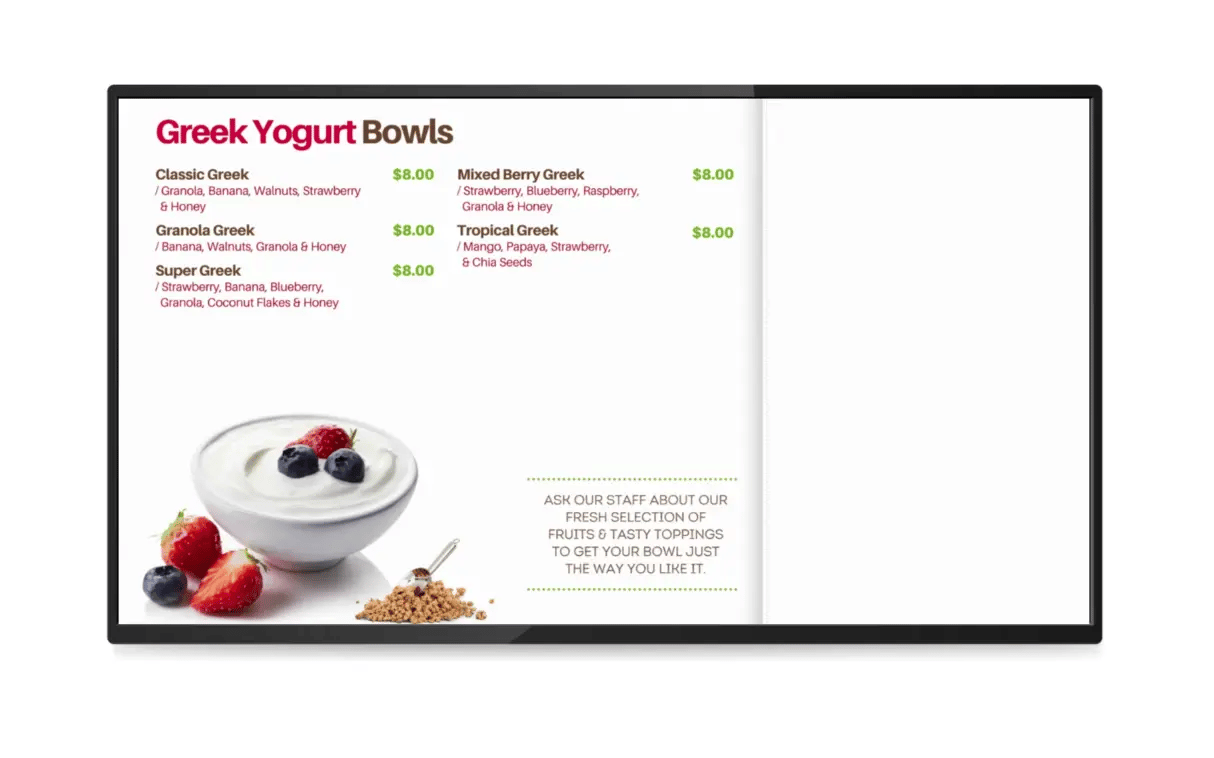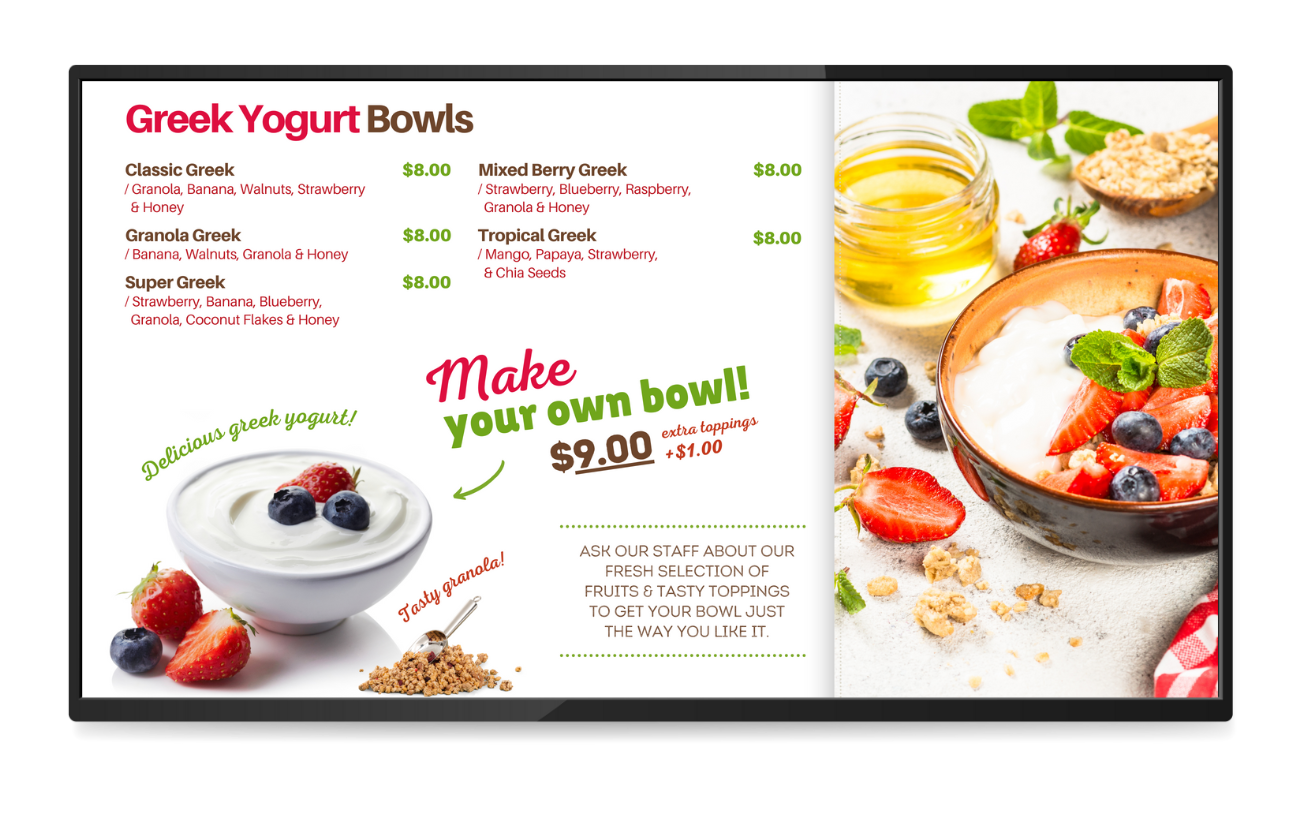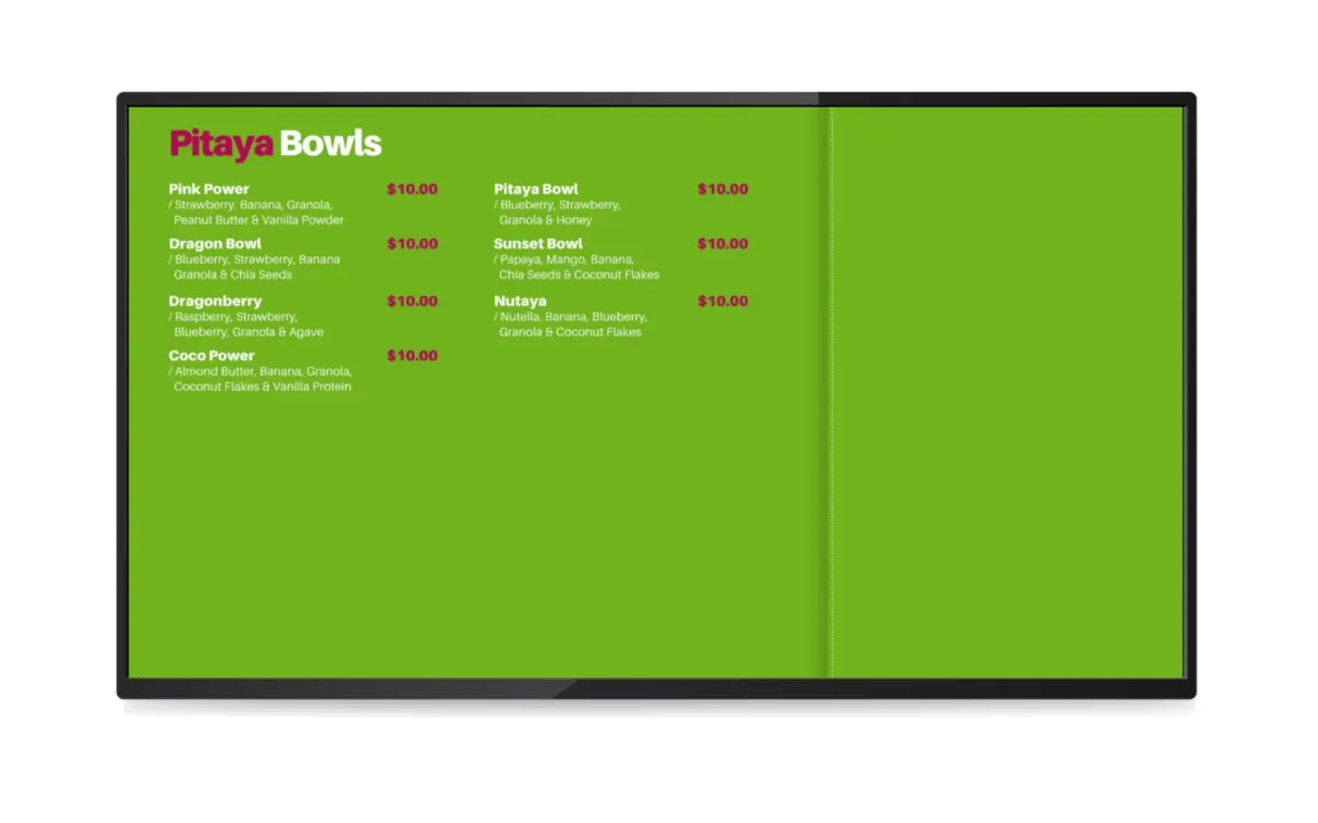 Tired of spending on your traditional paper menus? Upgrade to a digital menu board and cut down or eliminate your printing cost. You'll enjoy a hassle-free installation and no longer have to worry about updating your menu.